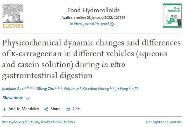 近日,食品科技领域国际顶级期刊《Food Hydrocolloids》(IF:9.15,中科院一区,TOP期刊)在线发表了开云海洋与食品学院食品科学与工程团队教师郭娟娟副教授的最新研究成果,论文题目为“Physicochemical dynamic changes and differences of κ-carrageenan in different vehicles (aqueous and caseinsolution) during in vitro gastrointestinal digestion”。开云为第一署名单位,联培硕士生朱斯亮为论文共同第一作者,通讯作者为福建农林大学庞杰教授。该研究得到国家自然科学基金(32001625)、国家自然科学基金(41706139)、福建省自然科学基金(2020J05159)和开云kaiyun官网人才引进与科研启动项目(H19007)资助。