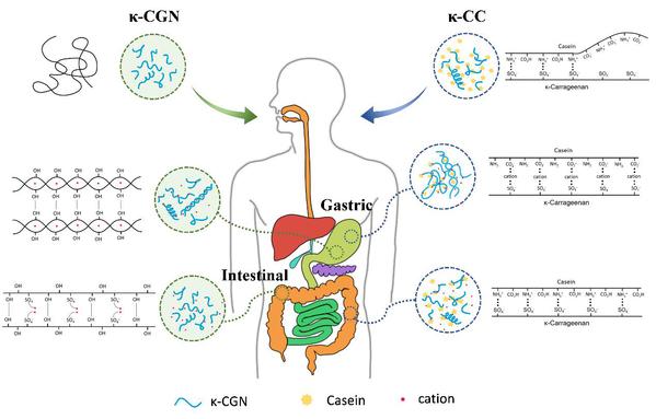 据悉,卡拉胶(Carrageenan,CGN,200-800kDa)是一类广谱的食品(糖果、饮料、奶酪、香肠、冰淇淋、奶粉等)增稠剂或乳化剂,然而,CGN的安全性和毒理学已经引起了来自世界各地不同机构的关注,并且越来越多的研究结果表明CGN的结肠致炎性及其可能的机制。但与卡拉胶多糖结肠致炎性相关的构效关系至今并没有详细报道。该研究探究了模拟消化体系中,卡拉胶在不同溶剂中的物理化学构象变化。研究结果显示,κ-卡拉胶(κ-CGN)在消化过程中化学结构没有发生显著变化,但其物理构象经历了coil-helix-coil转变,且消化液中κ-CGN溶液暴露的硫酸基含量呈下降趋势。而在κ-卡拉胶/酪蛋白(κ-CC)溶液中,κ-卡拉胶由于与酪蛋白之间的氢键和静电相互作用而保持稳定的helix结构,且κ-CC溶液中暴露的硫酸基含量始终低于κ-CGN溶液。酪蛋白的存在减少了硫酸基的暴露,提高了κ-CGN的构象稳定性。因此,不同溶剂条件下CGN构象和暴露硫酸基含量的差异可能导致胃肠道中不同的炎症作用,该构效关系的阐述对于指导卡拉胶的安全应用生产具有重要意义。