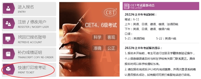 2022年6月全国大学英语四六级考试于6月11日进行,凡成功报考本次四六级考试者,可于6月1日9时登录全国大学英语四、六级考试报名网站 打印准考证。详细打印流程如下: