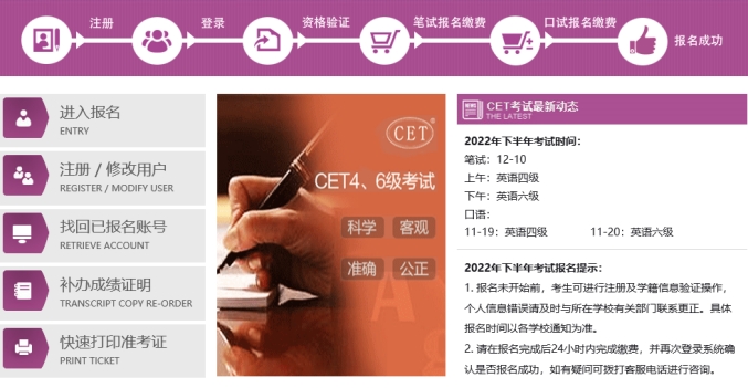 2022年12月全国大学英语四六级考试于12月10日进行,凡成功报考本次四六级考试者,可于12月1日9时登录全国大学英语四、六级考试报名网站 打印准考证。详细打印流程如下: