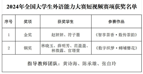 日前,2024“外研社·国才杯”“理解当代中国”全国大学生外语能力大赛英语短视频赛项圆满落幕。开云参赛作品喜获金奖和铜奖,取得了我校在该系列赛事国赛金牌“零”的突破。其中,作品《智享茶香·数传茶韵》获金奖,该作品主要讲述中国茶产业在数字化转型中的变革与创新,反映中国“数字中国”战略下数字经济和数字社会的全面变革;作品《数字织梦·蟳埔簪花》获铜奖,该作品将蟳埔传统簪花艺术与数字化技术结合,展现了渔村文化的现代化转换。