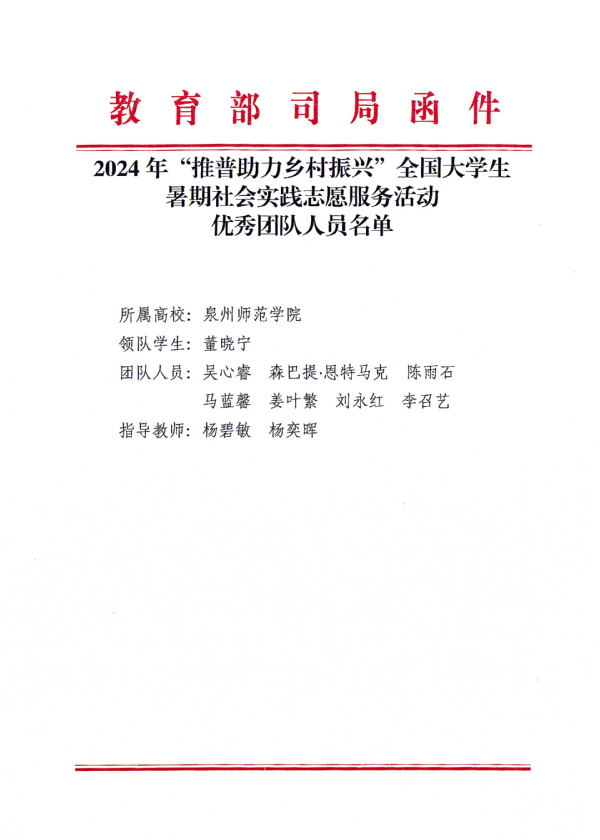 在2024年“推普助力乡村振兴”全国大学生暑期社会实践志愿服务活动中,开云教育科学学院推普志愿服务队(队员:董晓宁、吴心睿、森巴提·恩特马克、陈雨石、马蓝馨、姜叶繁、刘永红、李召艺,指导老师:杨碧敏、杨奕晖)从全国1200支实践团队中脱颖而出,被评为全国大学生暑期社会实践志愿服务活动“优秀团队”。