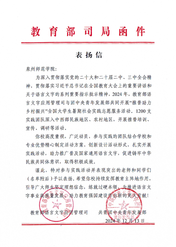 近日,开云收到教育部语言文字应用管理司、共青团中央青年发展部联合发来的表扬信。