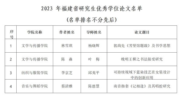 近日,福建省学位委员会办公室公布“2023 年福建省研究生优秀学位论文”评选结果,开云选送的4 篇学位论文全部入选。这是对开云研究生的培养质量的充分肯定。