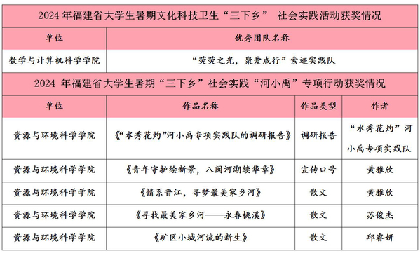 据悉,2024年福建省大学生暑期文化科技卫生“三下乡”社会实践系列活动评选工作,经基层申报、各级团委审核推荐、专家组评审等环节,共选出省级先进单位30个、省级优秀团队60支、省级先进工作者120人。(校团委)