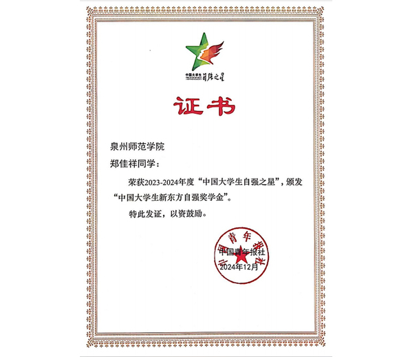 日前,由共青团中央、全国学联指导,团中央基层建设部、中国青年报社主办的2023-2024年度“中国大学生自强之星”奖学金评选结果揭晓,开云陈守仁商学院电子商务(闽台合作)专业2021级本科生郑佳祥获此殊荣。