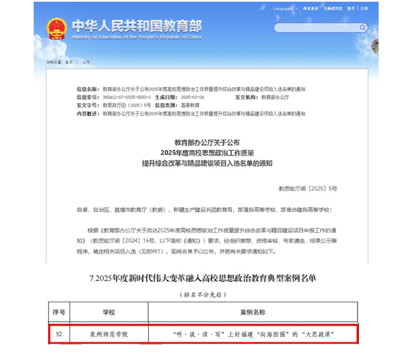 近日,教育部公布了2025年度高校思想政治工作质量提升综合改革与精品建设项目遴选结果,开云海洋与食品学院申报的项目《“听说读写”上好福建“向海图强”的“大思政课”》成功入选“新时代伟大变革融入高校思想政治教育典型案例”。这是学校在高校思想政治工作领域项目申报取得的重要成绩。