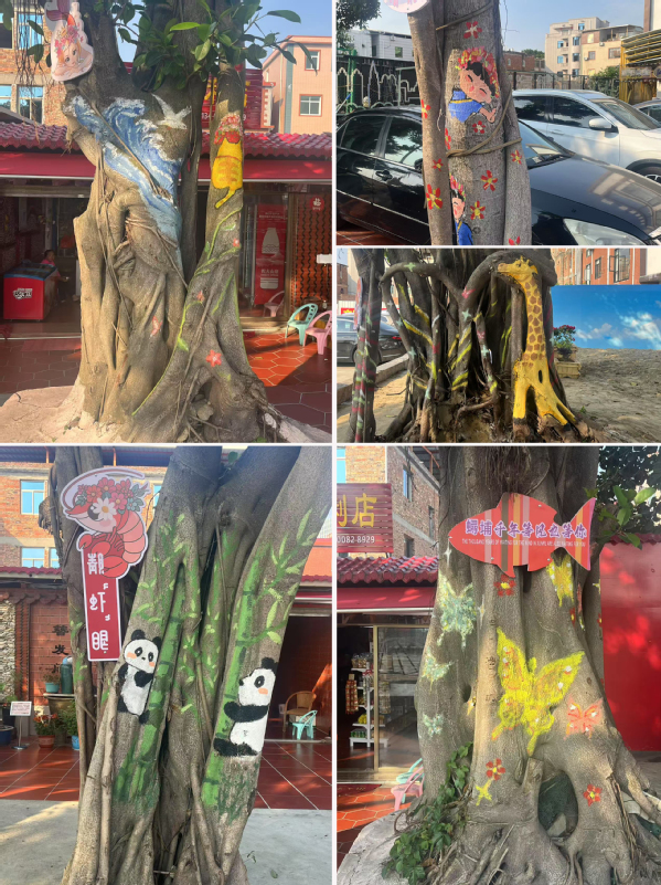 活动前期,彩绘团队深入蟳蜅社区调研并走访非遗传承人,收集海丝文化元素,选定榕树作为创作载体,串联起渔村历史与当代审美,组成彩绘活动的核心视觉符号。创作过程中,彩绘团队运用多种绘画技法在树群表皮呈现多元意象,既有海浪翻涌、白鸥逐浪的动态海景,也有头戴簪花、面带笑容的蟳蜅女形象。此外,团队还创新植入熊猫竹林、蝶舞花间、长颈鹿徜徉等自然图景,展现出了中外海丝文化的交融。