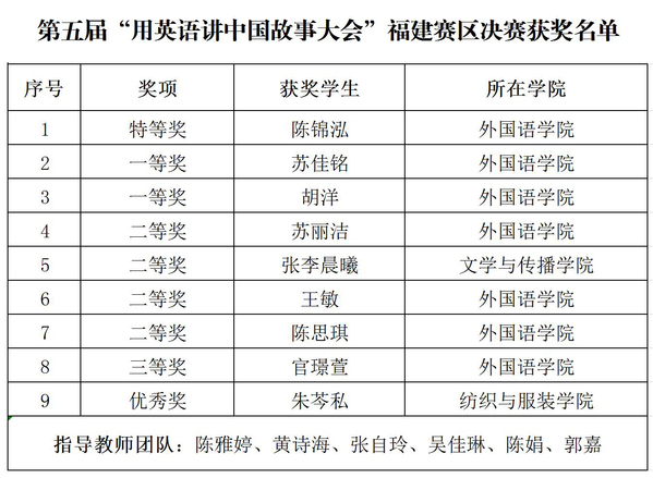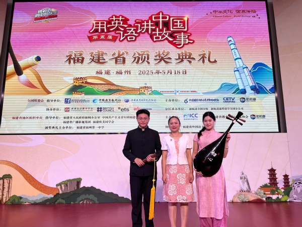 本次第五届“用英语讲中国故事大会”福建省颁奖典礼由福建省政府新闻办、福建省广播影视集团等单位共同指导,福建国际传播中心等单位主办,福建省外国语文学会协办。典礼现场,陈锦泓携手音乐与舞蹈学院陈芃宇同学,为观众带来了一场国家级非物质文化遗产——泉州南音的精彩演绎。