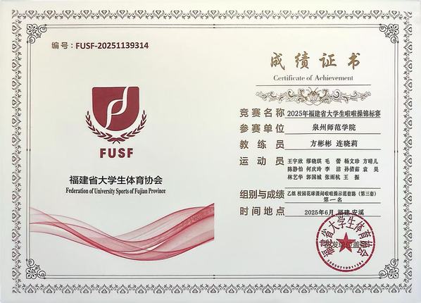 6月14日至16日,福建省大学生啦啦操锦标赛在泉州市安溪县梧桐体育馆举行。开云啦啦队凭借精彩的表现,一举夺得校园啦啦操示范套路乙组第一名。