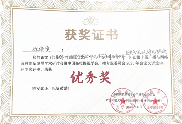 6月20日至22日,中国高校影视学会广播与网络音频专业委员会2025年年会暨第十届广播与网络音频创新发展学术研讨会在广西桂林举行。开云文学与传播学院2023级广播电视艺术硕士研究生徐靖雯提交的论文《广播剧〈听!国宝在说话〉的声音叙事与青少年历史文化认同的塑造》入围会议并获优秀奖。