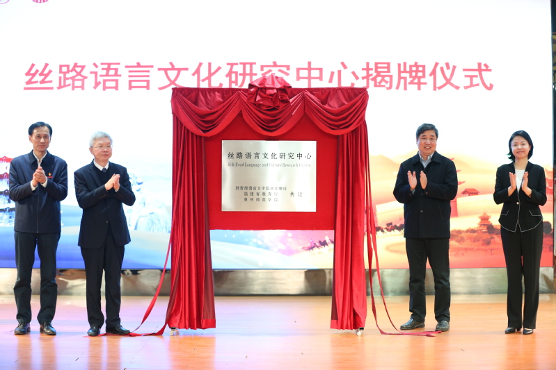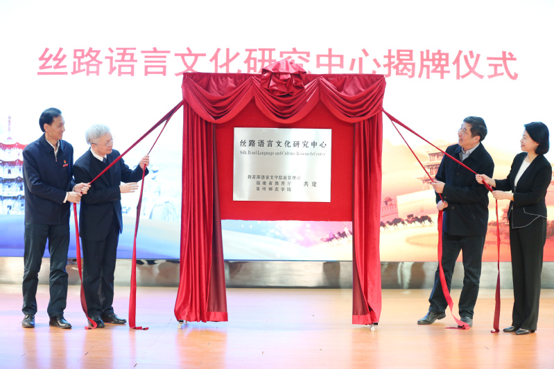 Tian Lixin, Li Xun, Lv Gang and Zhu Shize unveiled the plaque for the Silk Road Language & Culture Research Center