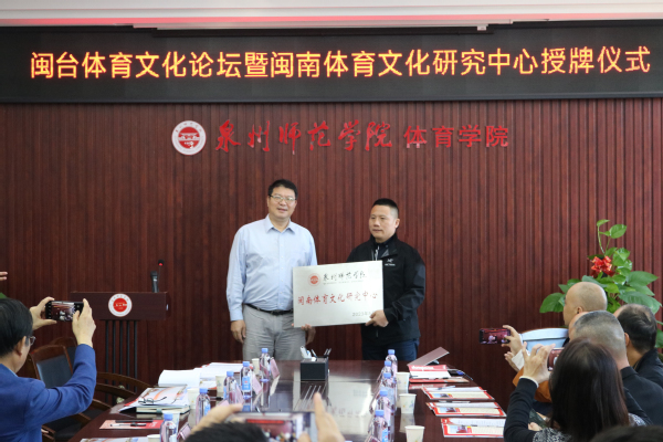 During the event, Xiahou Jianbing, a Standing Committee member of the University CPC Committee and Vice President, awarded the plaque of “Quanzhou Normal University Minnan Sports Culture Research Center” to the School of Physical Education. Cui Lequan, a professor of library science at the Sports and Cultural Development Center of the General Administration of Sports of China and expert enjoying special allowances from China’s State Council, delivered a keynote report entitled Exchanges of Traditional Sports between Fujian and Taiwan and Cross-Strait Cultural Identity. At the subsequent roundtable themed on New Opportunities for Sports Development in Fujian and Taiwan Under the Context of New Cross-Strait Integration, the participants, focusing on the exploration into and the protection and promotion of traditional sports culture, conducted in-depth discussions on the inheritance, development, innovation, and social impact of sports culture in the southern Fujian and Taiwan.