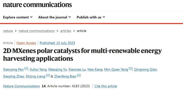 Recently, the research paper 2D MXenes Ppolar Catalysts for Multi-renewable Energy Harvesting Applications by QNU Professor Pan Xiaoyang's team from the School of Chemical Engineering and Materials was published online in the prestigious international journal Nature Communications (IF: 16.6, Chinese Academy of Sciences Category I, TOP Journal, H-index 248). QNU is the first signing unit, with Professor Pan Xiaoyang as the first and corresponding author. Professors Yang Minquan from Fujian Normal University, Liang Shijing from Fuzhou University, and Bian Zhenfeng from Shanghai Normal University are listed as the co-corresponding authors.