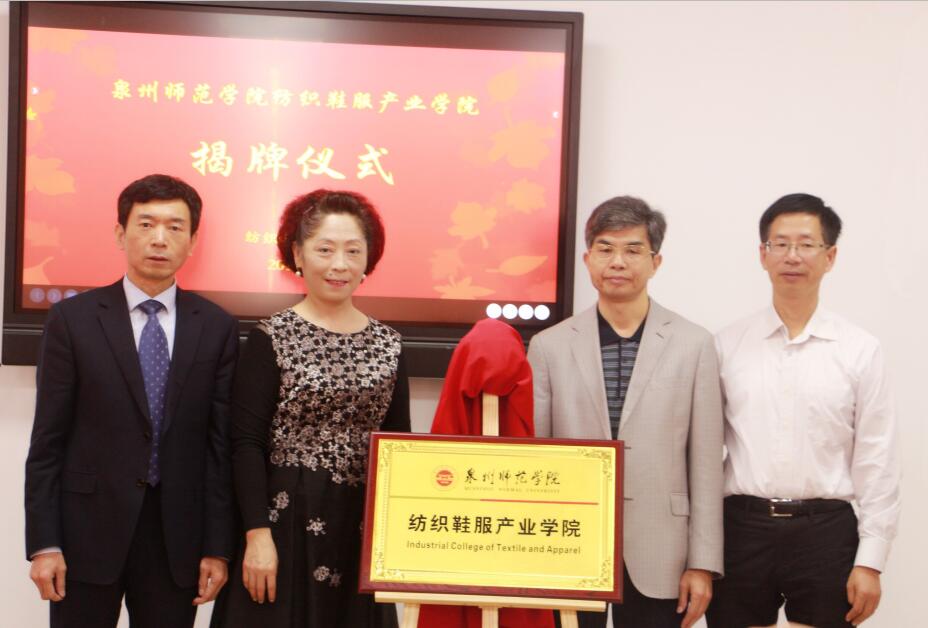 王珊为揭牌仪式致辞。她首先代表学校向与会领导与来宾表达欢迎与感谢,并向大家介绍了学校的建设发展情况,她肯定了纺织与服装学院成立一年来取得的成绩,希望学院全体师生团结一致,再接再厉,争取新突破,同时期待以产业学院的成立为契机,搭建一个开放互动的产学研、政校企交流合作平台,为服务地方产业发展贡献力量。王珊、吴金埔、傅玉波、邱夷平共同为纺织鞋服产业学院揭牌。
