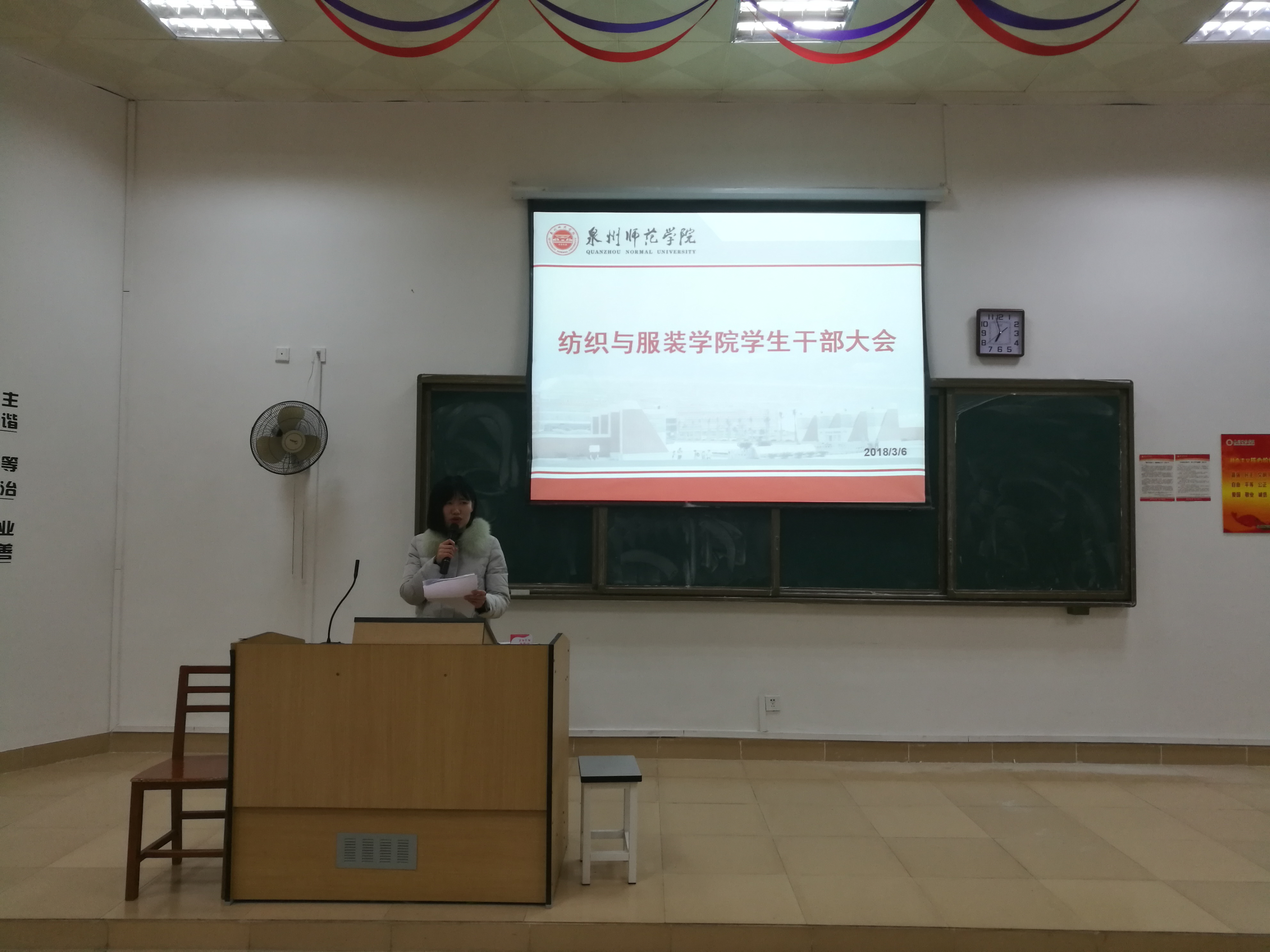 36日晚,纺织与服装学院于荣助楼212教室召开新学期学生干部大会。本次大会由学工办副主任、团委副书记聂主持,学院辅导员、两委会及班级主干参加会议。