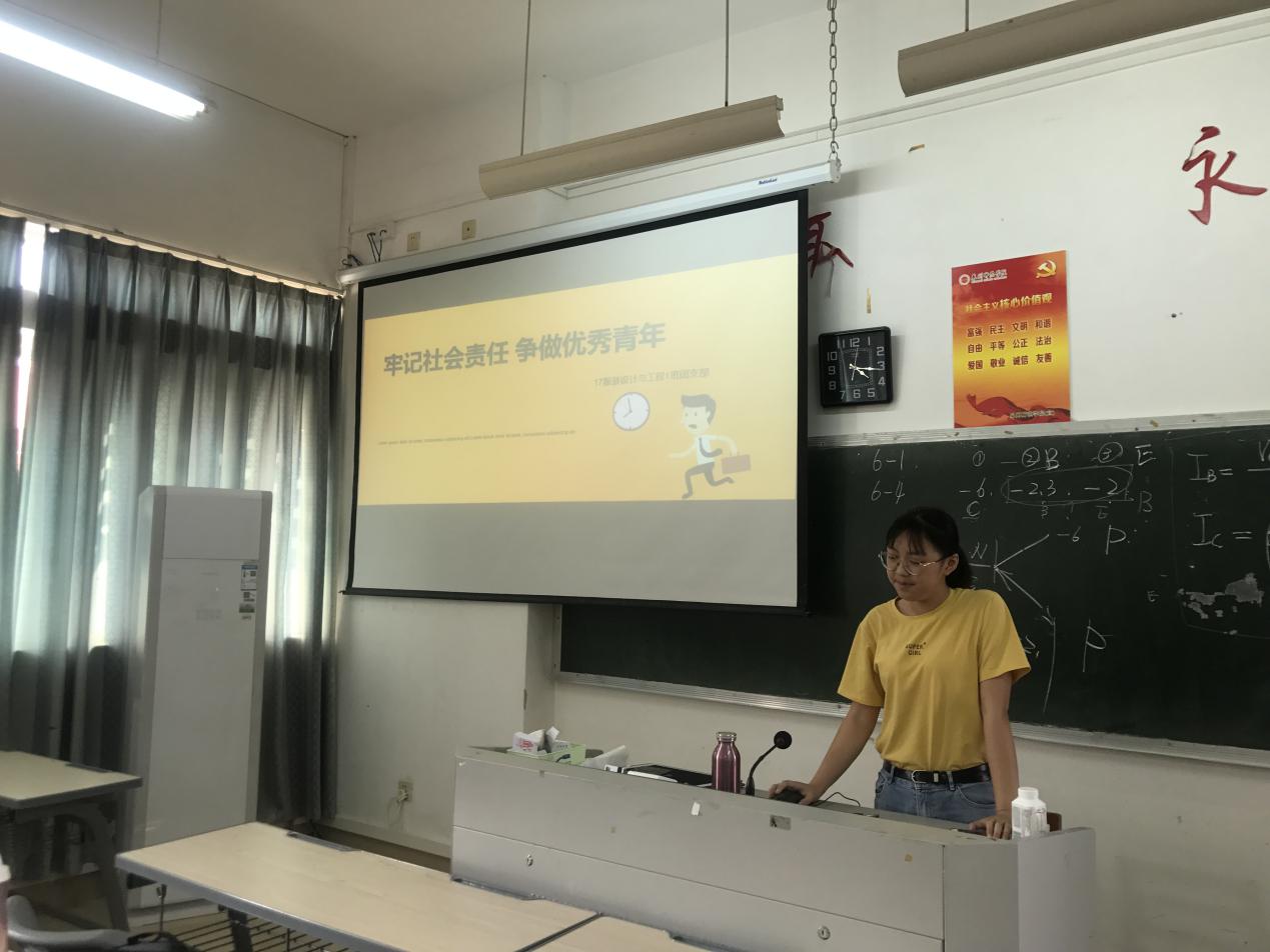2017级服工班通过制作ppt并上台宣讲的形式,加强同学对社会责任感的认识,要求同学通过提高自身认知水平、文化修养,树立良好形象,做有担当的时代青年。2017级服设班结合学校环境、工作环境、家庭环境,对当代青年需要承担的社会责任进行思考总结,同学们一一发言,积极讨论作为一名大学生身上的使命担当。