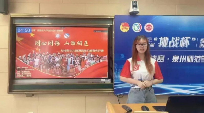 在此期间,她也作为成员获得了2021年国家级大学生创业训练项目立项。手持“同心同语”接力棒,作为负责人带领团队参加第十二届“挑战杯”福建省大学生创业计划竞赛并获得省级银奖;主持2022年国家级大学生创业训练。大创比赛结束后,不断回忆起在结束甘肃东乡公益之行时一位年仅九岁的小男孩说的话:“大哥哥大姐姐,我喜欢你们上的课,喜欢你们讲的故事,读的文字。我想走出大山,继续读书,去看看外面的世界...”那澄澈而又充满渴望的眼神一直在她内心深深印刻。