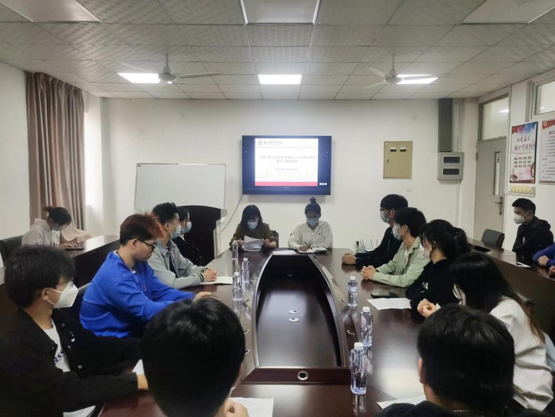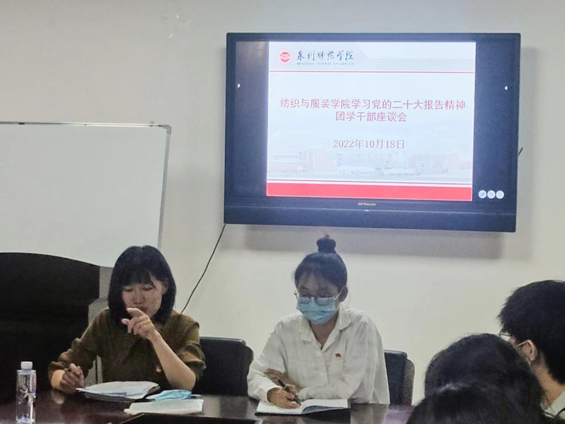10月18日下午,纺织与服装学院在王爱约楼701会议室举办学习党的二十大精神团学干部座谈会。学院学工办主任、团委书记聂莹,辅导员廖春霖及团学干部代表参加。