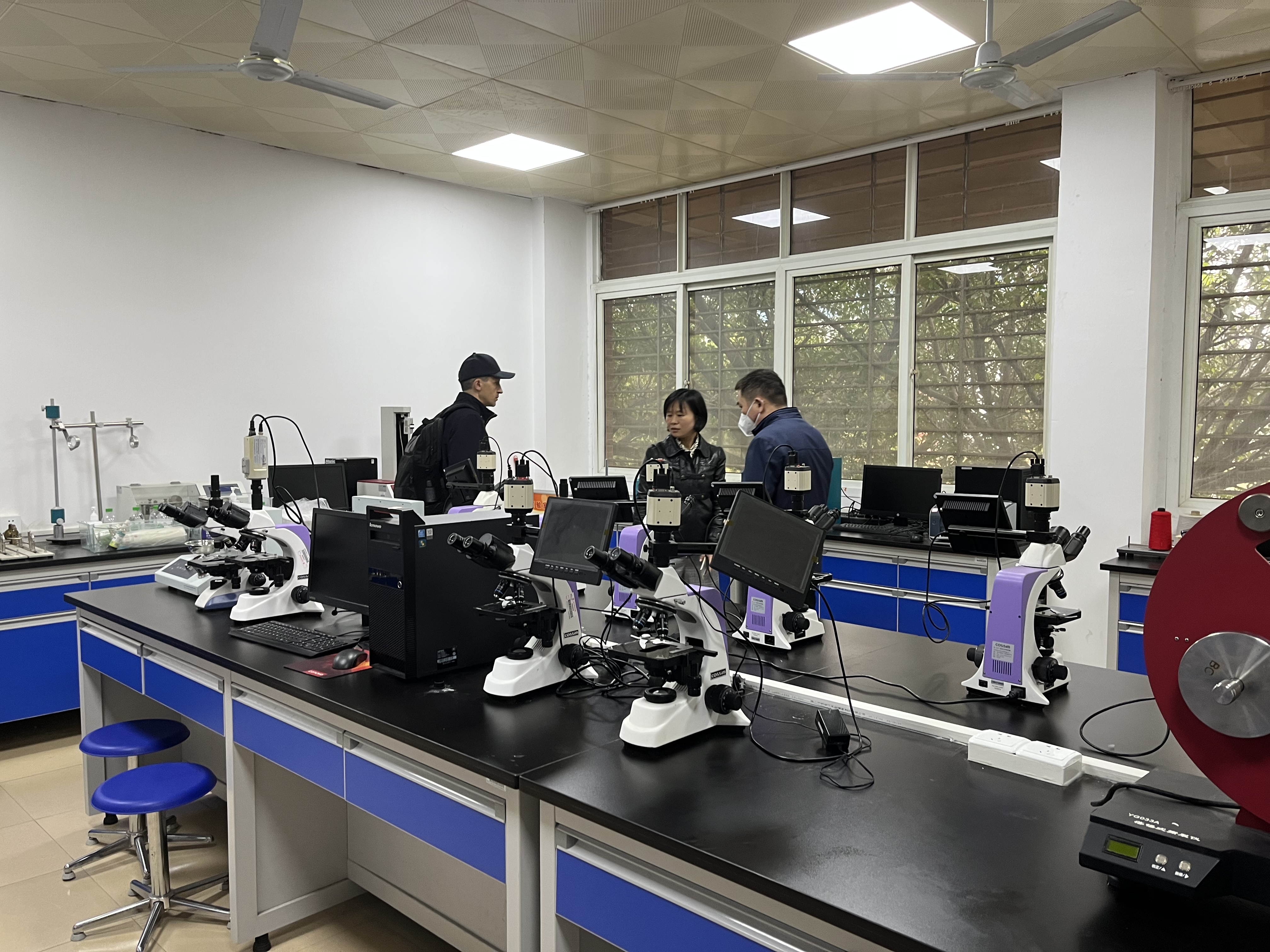 会后,圣东尼公司一行参观学院纺织基础实验室、纺纱实验室、织物小样试织实验室、小样织机室、面料创意设计实验室、生态纺织材料与染整实验室等。