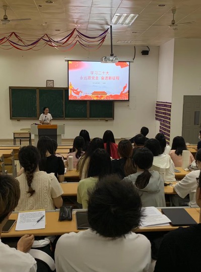 廖春霖讲解了党的二十大召开的背景和意义,进一步加深同学们对党的认识,提升党员责任意识,同时向同学们提出三点要求:一是要以学铸魂,筑牢信仰根基;二是要锤炼品格,强化责任担当;三是要实干创新,练就过硬本领。