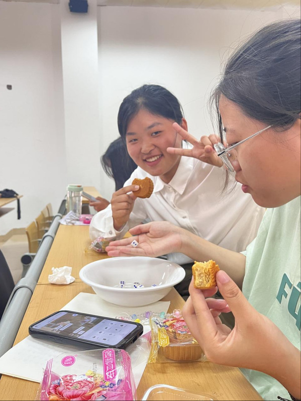 活动的最后是中秋博饼环节。据传,中秋博饼是300多年前民族英雄郑成功屯兵厦门,为排解士兵佳节思念家乡亲人之苦发明的一种游戏,而后流传至今,成为闽南地区独有的民俗文化。本次博饼活动采用的是传统的博饼方式,现场的同学们共被分为6组,将骰子投掷进碗中,发出清脆悦耳的“叮叮当当”声。现场投掷声清脆悠扬,欢笑声此起彼伏,同学们在轻松愉快的氛围中深入交流,感受中华优秀传统文化的独特魅力,尤其是外地同学们从没有参加过博饼活动,对此更加感到新奇,通过博饼进一步了解闽南风俗文化。
