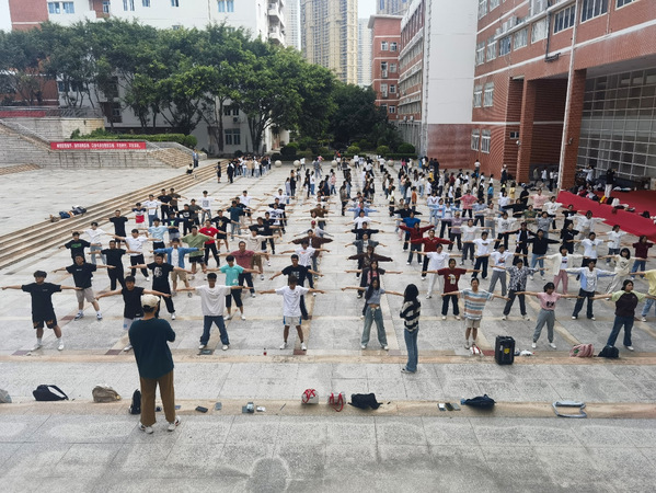 每日午后,96名由2023级新生组成的广播操队伍在中山广场迅速集中,充分利用课余时光进行广播操训练。“第十套广播体操现在开始”,随着音乐的响起,同学们整齐划一地跟着节拍,伸臂、蹬腿、扩胸、转体,动作娴熟、张弛有度,一遍又一遍精准做好每一个动作,力求每个动作都做到最好,争取达到“快、静、齐”训练目标。学生会文艺部负责人将动作拆解,耐心细致进行教学。训练尽管充满疲惫和困意,却未能阻挡队员们训练的脚步,他们昂着头,挺着胸,展现了纺服学子健康向上、朝气蓬勃的精神风貌。