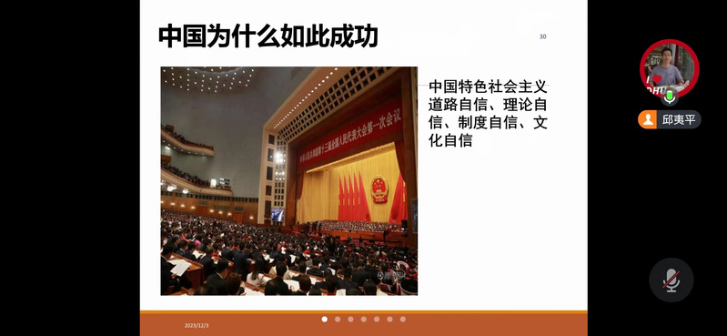 12月3日,学院党委副书记、院长邱夷平结合自己留学海外经历,从“中国为什么成功”这一主题出发,向同学们讲解了改革开放40年来,中国在各个领域取得的突破与成就,并希望同学们始终保持自我革命的精神,励志进取,发奋图强,为中华民族伟大复兴作出贡献。