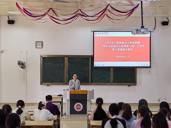 为深入学习贯彻习近平新时代中国特色社会主义思想和党的二十大精神,加强入党积极分子和大学生骨干思想政治教育,4月11日中午,纺织与服装学院在荣助楼212梯教举行2024年入党积极分子培训班暨“青年马克思主义者培养工程”大学生骨干培训班开班式。学院党委副书记、院长邱夷平,培训班班主任李晓希和全体学员参加。