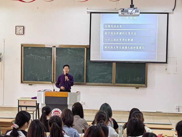 开班式后,邱夷平为培训班学员讲授主题为“学习贯彻习近平总书记关于加强和改进民族工作的重要思想,勇担铸牢中华民族共同体意识的主力——新疆棉和高校纺织援疆团十年”的党课。他从屯垦戍边历史、新中国在新疆的屯垦戍边、十万上海知青赴疆、新时代大学生援疆之路和高校纺织援疆团四个方面,介绍了屯垦戍边中革命先辈们的英雄事迹和新时代大学生的援疆故事,引导同学们向革命先辈学习,弘扬屯垦戍边和援疆精神,鼓励同学们积极参与到援疆活动中,以实际行动让青春在党和人民最需要的地方绽放绚丽之花。