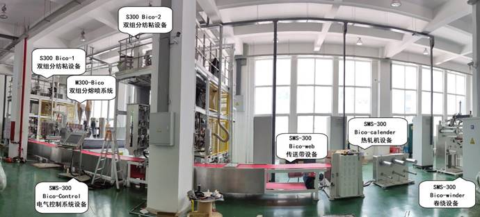 图2双组份纺粘熔喷非织造复合材料中试生产线
