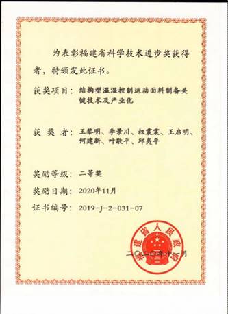 依托实验室的人才优势及科研条件,近三年来,实验室获批各类科研项目50余项,其中国家级项目2 项,省部级项目8项。发表SCI、EI收录论文60篇;申请各项专利58项,其中,发明专利40项。2019年,实验室成果“结构型温湿控制运动面料制备关键技术及产业化”荣获福建省科学技术进步奖二等奖。