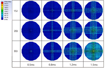 图2 不同冲击能量下织物不同时刻的应力分布