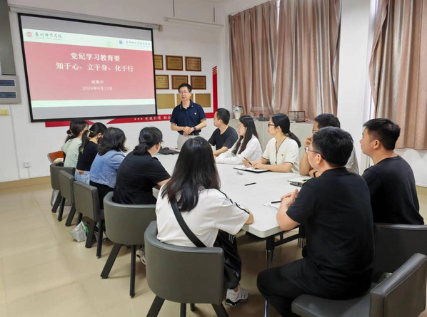 6月13日下午,纺织与服装学院党委副书记、院长邱夷平以“党纪学习教育要知于心、立于身、化于行”为题讲授党纪学习教育专题党课,教工第一党支部全体党员参加。