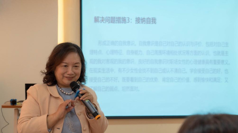讲座中,姚丹研究员结合实际案例及数据,以心理健康的视角,讲解了职场女性常见心理问题及防治,介绍或提出了“组织活动、公正评价、接纳自己、合理安排”等既实用又专业的方法,引导大家建立起积极平和的心态,“不再对自己的不足很焦虑”,拥有更强大的自我解压、情绪管控能力。