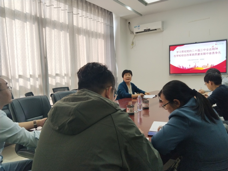 为深入学习贯彻党的二十届三中全会精神,引导全系党员干部准确把握全会精神的实质和丰富内涵,2024年12月5日,光电工程系党总支书记林蕙琼在千墅501室讲授专题党课,全系师生党员参加。