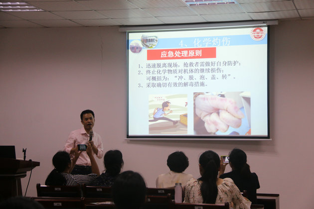 孙文栋副主任医师首先以真实的案例,强调急救的重要性。通过讲解和示范心肺复苏技术,让广大教师掌握应急救护技能。接着,着重讲述了危化品伤害现场急救和气道异物梗阻现场急救。结合日常工作和生活,分别就毒气泄漏、火灾、烧烫伤等突发事件,以生动的语言进行详尽讲解。并就背部叩击法、腹部冲击法等现场急救方法与教师进行了模拟操作和示范。