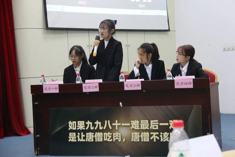 比赛开始,正反双方辩手依次做自我介绍,并提出观点。正方化制队认为如果九九八十一难最后一难是让唐僧吃肉,唐僧该吃,而反方化学队则持相反观点。立论阶段,双方一辩都针对自己的持方进行了阐述,接下来各方辩手积极发表自己的观点,比赛氛围异常激烈,整个赛程高潮不断。在自由辩论阶段,双方你来我往,言辞犀利,就辩题展开论述,唇枪舌战。比赛持续一个多小时,到最后总结陈词阶段,双方辩手依然精神饱满,妙语连珠。经过紧张的角逐,最终化制二班摘得本次桂冠。随后,评委就本次比赛进行点评总结,针对比赛中新生辩论手的不足和优秀发表意见,并为获胜方和最佳辩手颁发奖状。