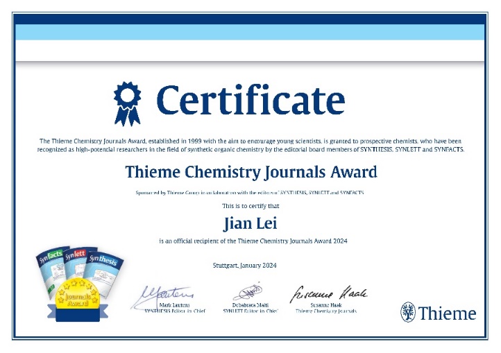 近日,德国Thieme学术出版集团公布了2024年度“Thieme Chemistry Journals Award”国际学术奖的获奖名单,我院“海洋与生物医药课题组”的雷健博士成功入选。