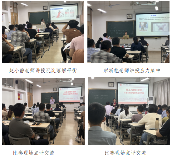 比赛现场精彩纷呈。参赛选手各显神通,赵小静老师在讲解沉淀溶解平衡时,通过“一颗龋齿的前世今生”探讨了沉淀溶解平衡的问题,引导学生用自己的专业知识解决生活中的问题,激发专业认同与社会责任感;而彭新艳老师在讲解应力集中时,以彗星型客机的多次解体坠毁事故为案例,讲述了应力集中的产生原因,表征方式和影响因素。