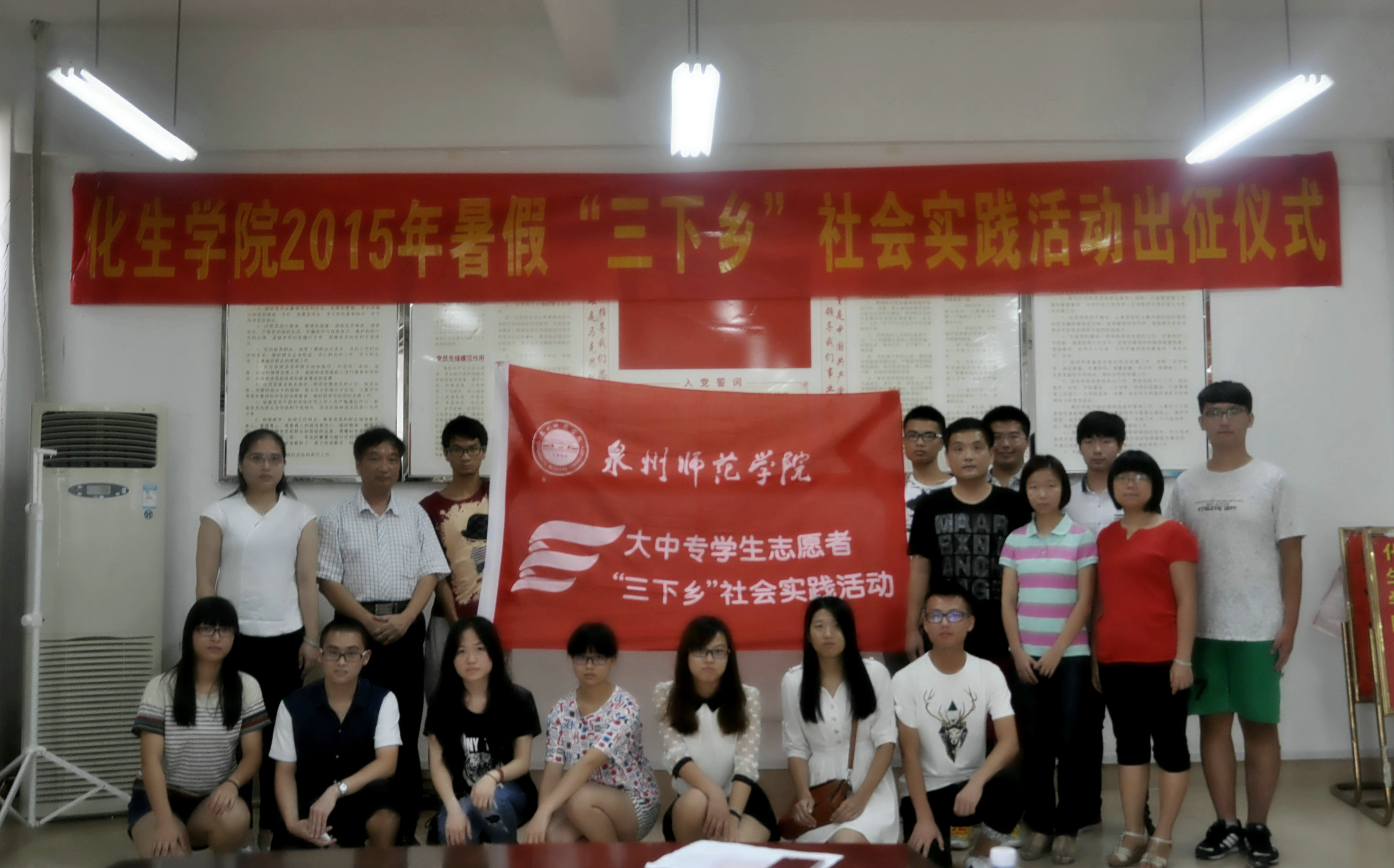 7月8日上午,化生学院2015年暑期“三下乡”社会实践活动出征仪式在宝龙310举行。 仪式上,蔡英卿教授强调了社会实践的重要意义,并表示,暑期社会实践活动是高校实践教育的重要组成部分,是培养大学生实践能力、创新精神和社会责任感的重要载体,是青年学子受教育、长才干、作贡献的宝贵机会。他期望同学们能够在社会实践中观察领悟“四个全面”,满怀热情投入到暑期社会实践中去。 刘洪漪老师在仪式上叮嘱,即将奔赴各地开展实践活动的老师和同学们注意人身安全,祝愿他们满载而归。 出征仪式后,我院7支队伍将奔赴各地展开实践活动,在实践中受教育,长才干,做贡献。