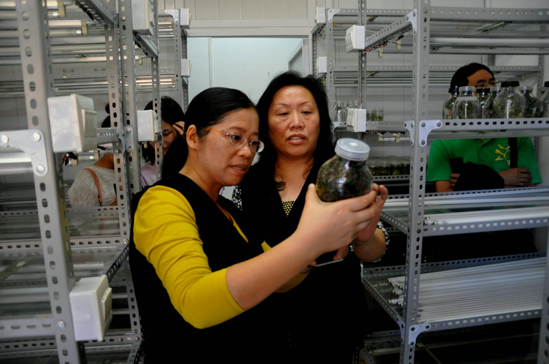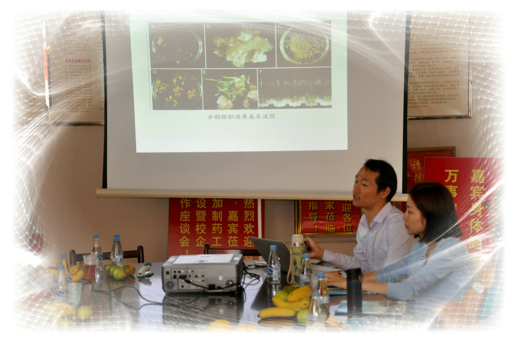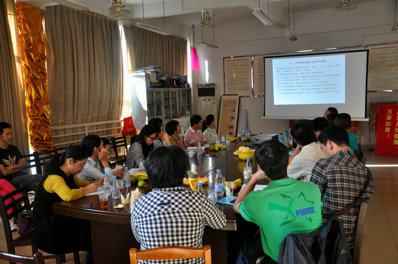 交流会上,蔡英卿书记对九中生物组的老师的到来表示热烈的欢迎,并就我院组培工作的相关师资力量进行了介绍。九中副校长黄山谈了此次交流学习的目的和意义。黄周英教授、桑庆亮博士应邀做“植物组织培养实验技术及组培室规划”的专题讲座,并对九中组培实验室建设与规划进行指导。