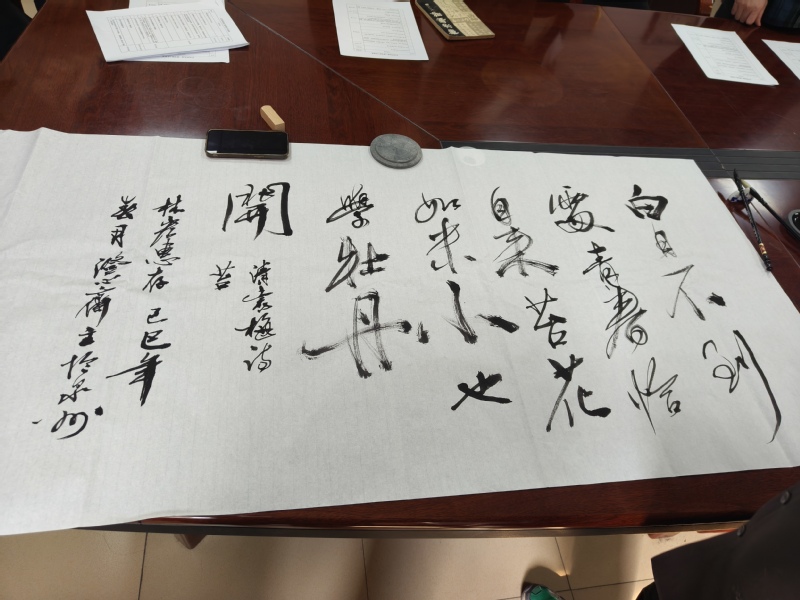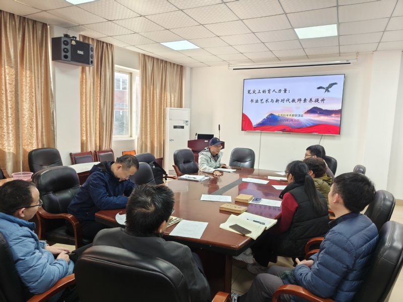 蒋国芳教授以“书法艺术中的育人哲学”为题展开分享。他结合自身幼时严苛的习字经历,坦言“父亲用红圈批改、罚站禁食的方式让我明白,书法锤炼的不仅是技艺,更是心性”。谈及书法理论,他手持毛笔示范“中锋运笔”,强调“力透纸背的笔锋如同科研的严谨——笔尖始终行走于笔画中线,方能成就字的立体感”。现场教师凝神屏息,感受着“心正笔正”与“立德树人”的内在共鸣。蒋教授更以《兰亭序》为例,剖析书法“气韵生动”与教师育人状态的关联:“教育如同运笔,需气息绵长、心神专注,才能在浮躁中守住育人初心。”在实践展示环节,蒋国芳铺展宣纸,现场创作诗歌《苔》。潇洒挥笔间,让教师们感受了书法的内涵与精髓。蒋教授适时引导:书法讲究“意在笔先”,这与我们备课时的教学设计同理,都需要预先构思整体框架。现场展开的热烈讨论中,教师们将书法章法结构与教学设计艺术相对照,碰撞出诸多育人智慧的火花。现场欢笑声中,蒋教授分享了一段往事:他曾拒绝日本高价收购画作,“书法承载文化根脉,教师更需守住教育者的气节”。这番话引发热烈讨论,教师们从章法布局谈到课堂设计,从“力透纸背”引申至“育人入心”,墨香浸润的教研室化作思想激荡的智慧场域。同时教师们纷纷结合立德树人的教育目标,探讨如何将书法艺术融入课堂教学,将传统文化的精神内涵传递给学生,培养学生的文化自信与审美能力,增强学生的文化认同感与民族自豪感。