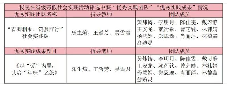 近日,中共福建省委教育工委公布了“追寻领袖足迹 体悟优秀传统文化”2024—2025学年全省大学生寒假社会实践活动评选结果。我院“青卿相助,筑梦前行”社会实践队获评“优秀实践团队”,《以“爱”为翼,共启“年味”之旅》调研报告获评“优秀社会实践成果”。
