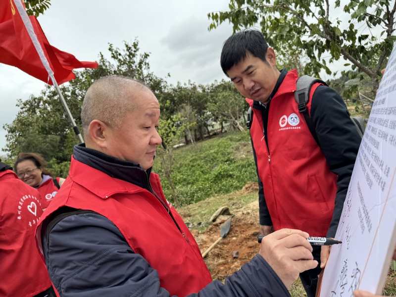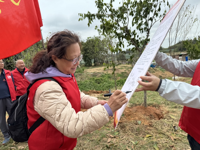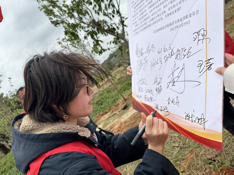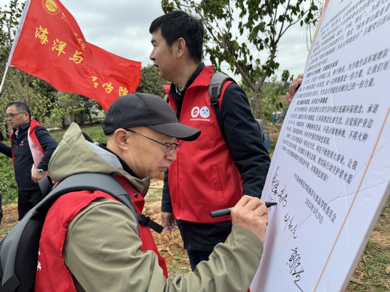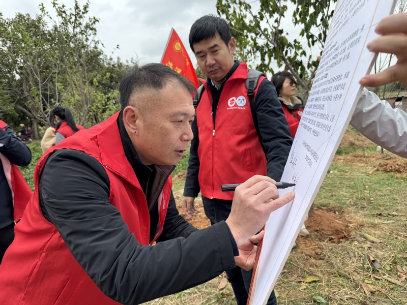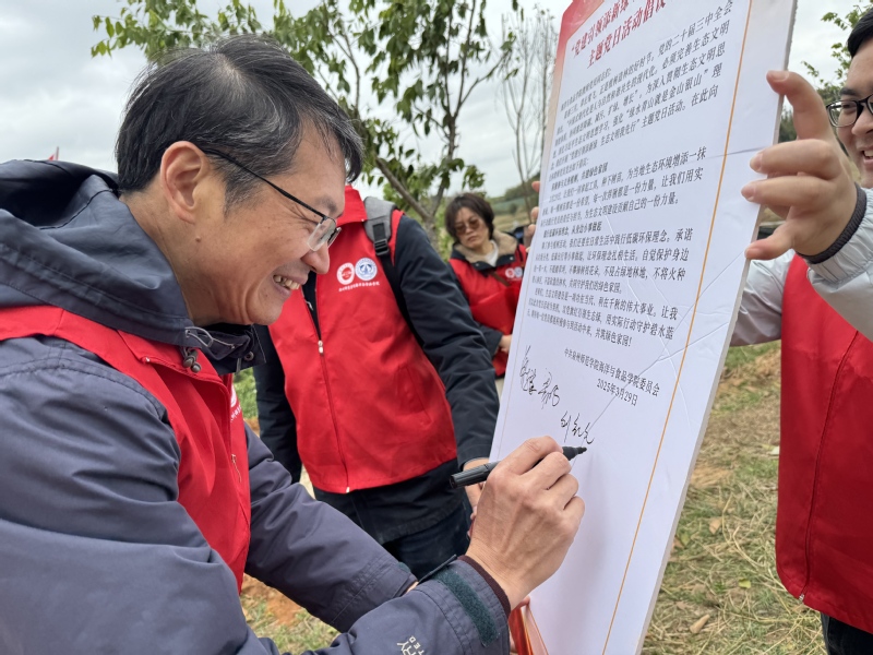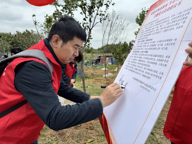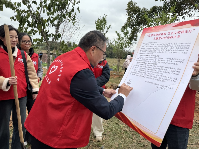 植树结束后,学院党委书记蔡志荣宣读了倡议书,并指出生态兴则文明兴,生态衰则文明衰,身为党员,要深刻理解“绿水青山就是金山银山”的理念,同时号召全体党员要做生态文明理念的坚定践行者,将绿色发展理念融入日常工作与生活,倡导低碳出行、节约资源,带动身边人参与生态环境保护。随后,党员们纷纷在倡议书上郑重签下自己的名字。