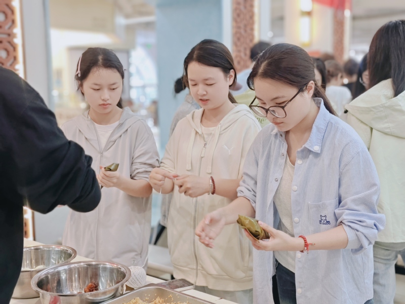 活动现场,粽叶飘香,气氛热烈。师生们围聚在一起,纷纷动手参与包粽子。捋粽叶、填糯米、放馅料、扎粽绳,一道道工序有条不紊。大家相互交流技巧,分享经验,欢声笑语不断。新手们在“老师”的指导下,从略显生疏到逐渐熟练,一个个形态各异却饱含心意的粽子在大家手中诞生。