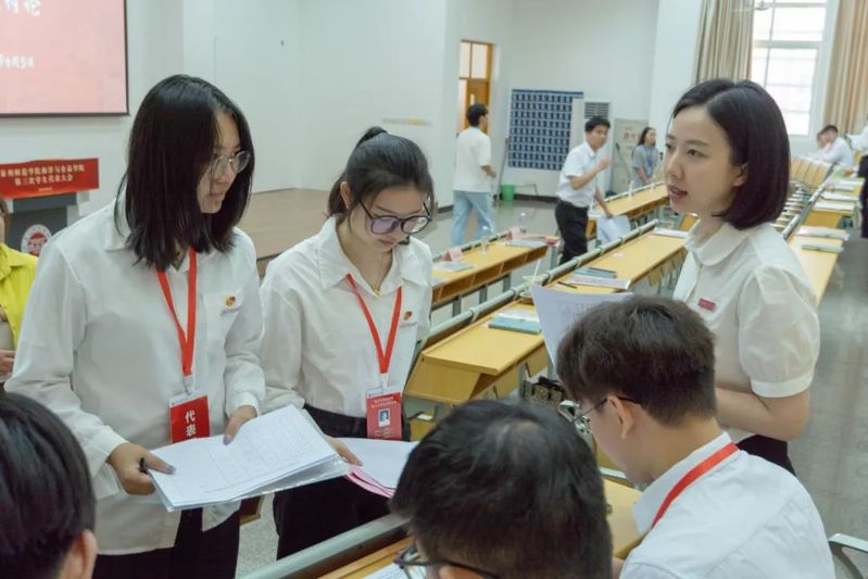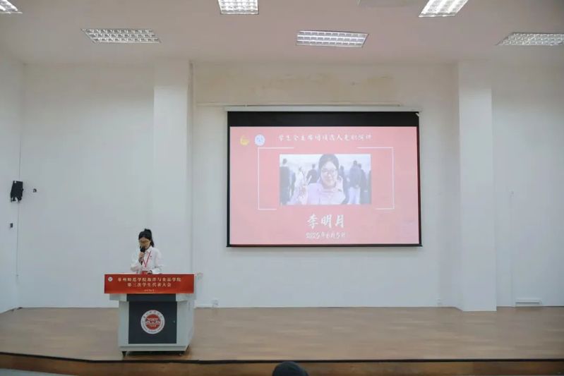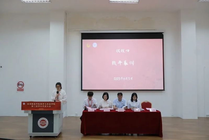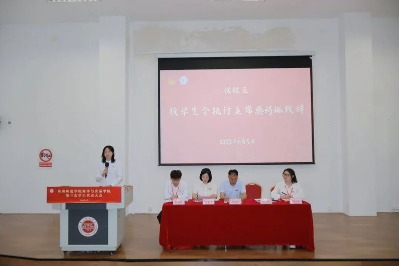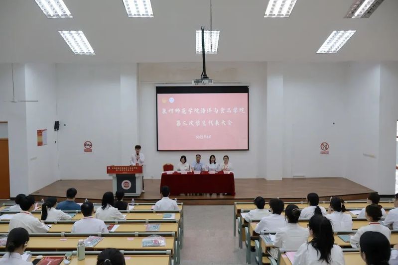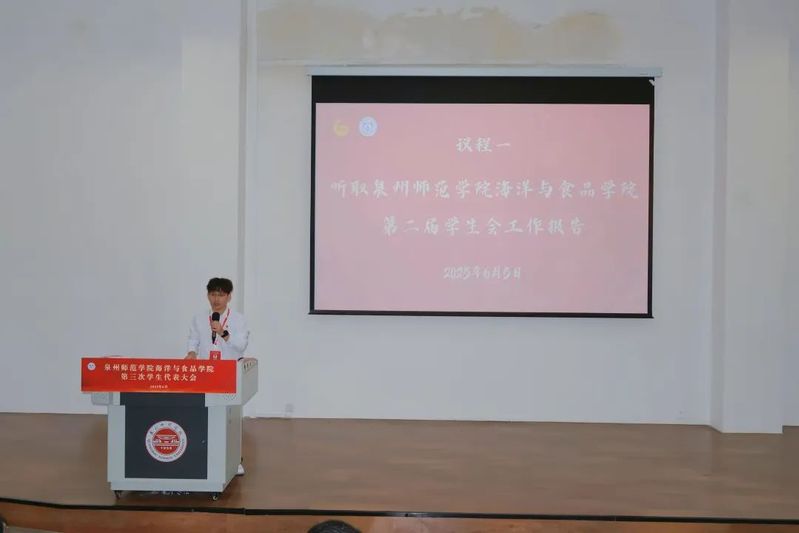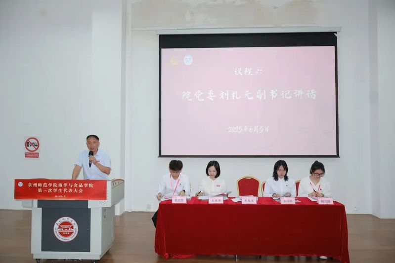 6月5日下午,海洋与食品学院第三次学生代表大会在孙中山大礼堂五楼梯教顺利召开。学院党委副书记刘礼元、校学生会执行主席蔡诗琳、学院团委副书记王哲芳、全体辅导员以及全院56名学生代表出席大会。