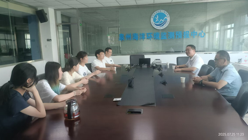 随后,一行人抵达泉州市海洋环境监测预报中心。在中心会议室,实习生们汇报了参与海洋生物标本分析采集、海水取样监测等核心工作的进展与收获。中心领导与学院一行围绕学生实习内容的深度、技术岗位安排及未来合作方向交换了意见。监测站站长刘保清对我院实习生的专业素养和严谨态度给予了充分肯定,并表达了与学院进一步深化合作、共同培育海洋领域人才的强烈意愿。蔡志荣着重强调了实习期间的安全纪律要求,他期望实习生们在确保安全高效完成岗位工作的同时,不忘学业精进,做到实践与学习相互促进、相得益彰。