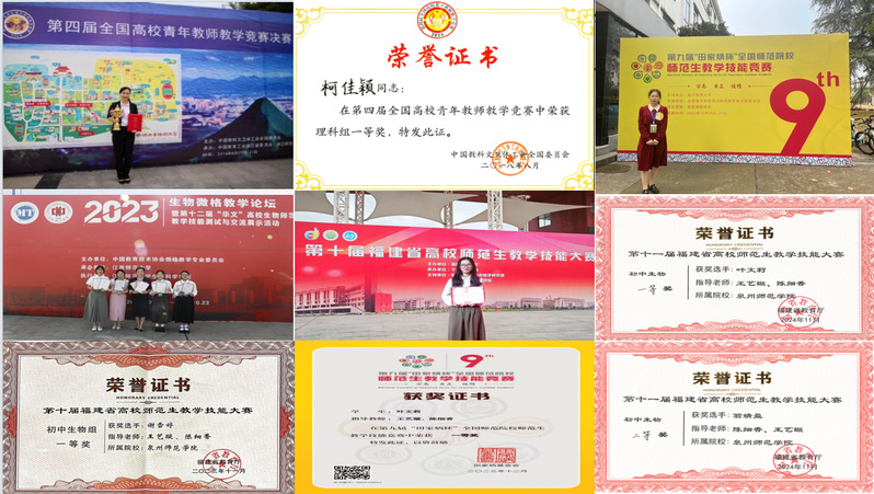 办学成效:主干课程《动物生物学》入选国家线上线下混合式一流课程,《基础生物学》入选省级一流线上课程。获批省级教改项目4项,省级课程思政示范项目2项,1名教师获全国青年教师教学竞赛一等奖。1名教师获福建省青年教师教学竞赛特等奖,1名教师获首届福建省高校教师教学创新大赛一等奖,1名教师获第二届福建省高校教师教学创新大赛二等奖,获福建省教学成果奖二等奖1项。学生近年获“华文”全国师范院校师范生教学技能大赛特等奖2人,三等奖以上32人,获全国田家炳师范生教学竞赛一等奖1人,二等奖1人,三等奖2人,全国科学教育教学创新竞赛二等奖9人,获全国大学生生命科学竞赛二等奖5人,获福建省高校师范生教学技能竞赛一等奖2人,二等奖4人,同时福建省在“挑战杯”大学省课外学术科技作品竞赛、全国大学生生命科学竞赛(创新创业类)中斩获佳绩。