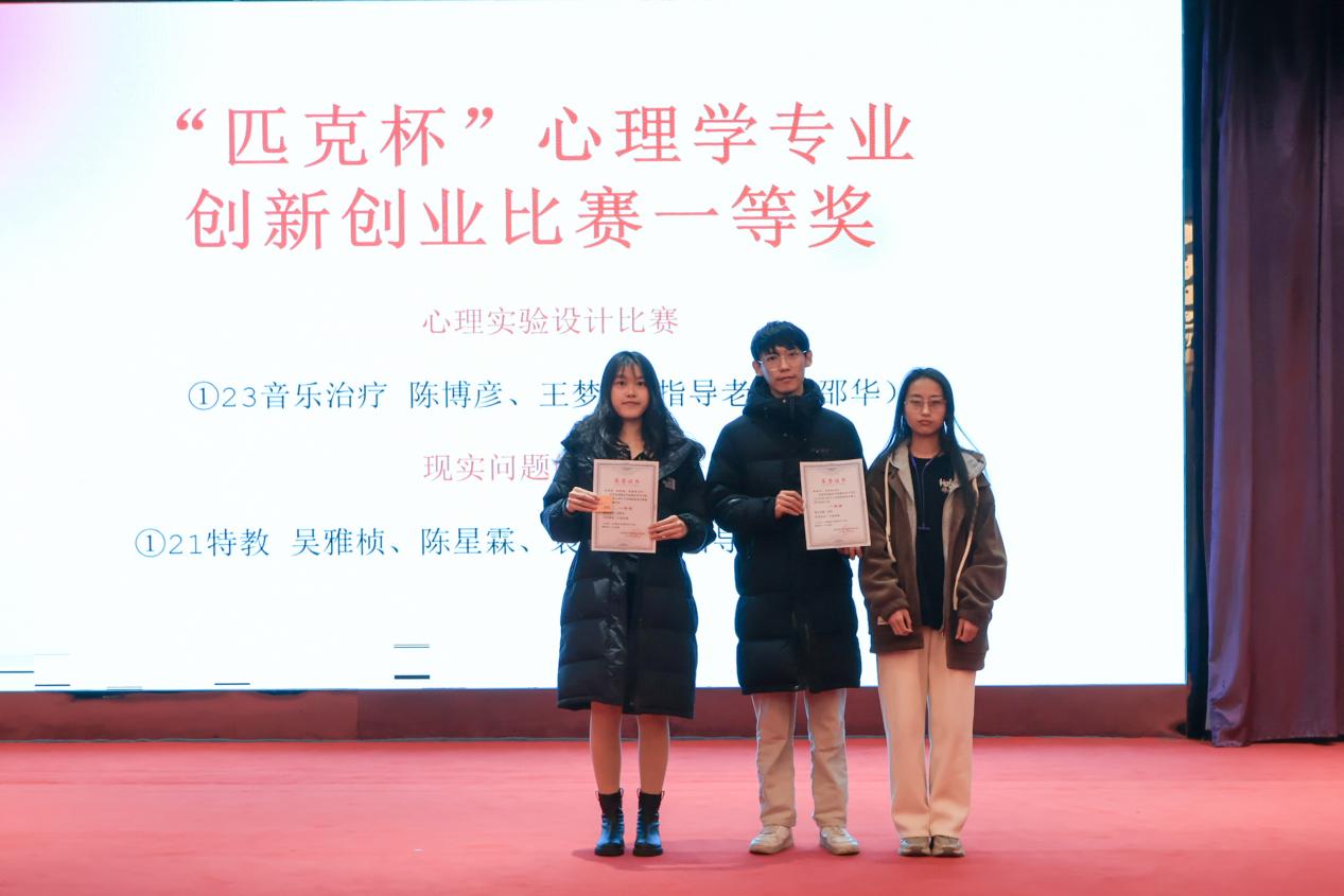 此次比赛分为心理实验设计、现实问题解决、学术论文本科生组、学术论文研究生组四个赛道,每个赛道设一、二、三等奖及优秀奖,共收到来自应用心理学系、特殊教育系、音乐康疗专业的多项作品(学术论文比赛尚在进行中)。23级音乐康疗陈博彦、王梦莹同学的作品《古琴音乐干预焦虑情绪的脑电研究》以及21级特教吴雅桢、陈星霖、袁佳妮同学的《“星星点灯——孤独症家庭喘息服务的先行者》,在众多参赛作品中脱颖而出,分别获得了心理实验设计组与现实问题解决组一等奖(其他奖项详见获奖名单)。